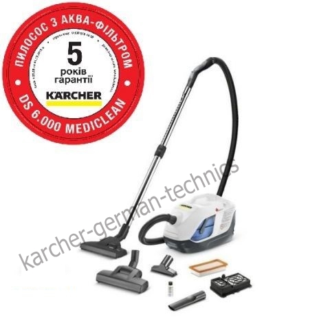 Представляем Вам новый пылесос с аквафильтром Karcher DS 6 PREMIUM, который вышел на замену пылесоса DS 6.000 Mediclean. Karcher DS 6 Premium Mediсlean - обновленная модель пылесоса с водяным фильтром (аквафильтром), укомплектованного HEPA-фильтром с наибольшей степенью задержания частиц, возможной среди бытовых пылесосов (HEPA-13). Новый DS 6 с турбиной 650 Вт обеспечивает ту же мощность всасывания, что и предшественник с двигателем 900 Вт, потребляя при этом еще меньше электроэнергии.