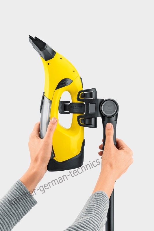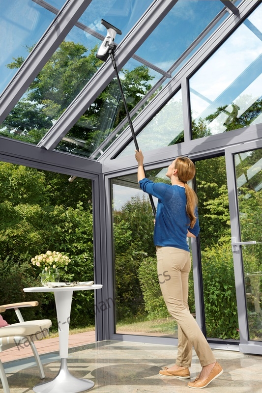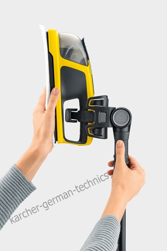 Мойка происходит в два этапа: с помощью закрепленной на удлинительной ручке насадки с обтяжкой из микрофибры, смоченной в моющем растворе или вибрационного очистителя KV 4 стекла очищаются от загрязнений. Угол наклона насадки легко регулируется с помощью шарнира. Далее - необходимо закрепить стеклоочиститель, с помощью которого собрать со стекол жидкость вместе с грязью.